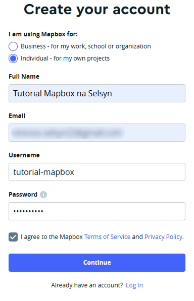 3° Em "Username" você deve escolher um nome que deseja ser utilizado dentro do Mapbox.