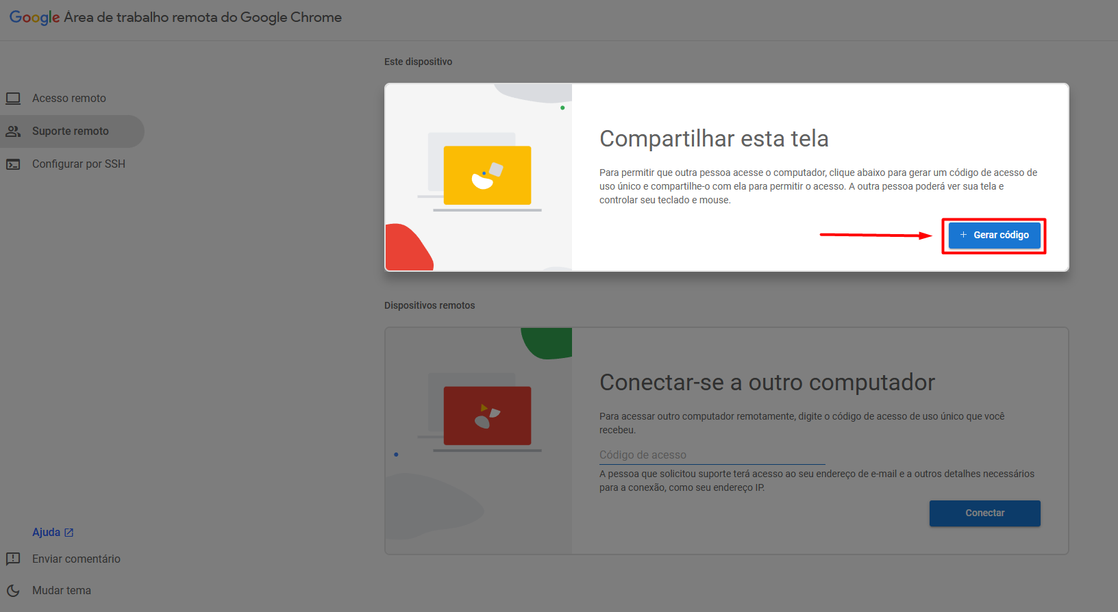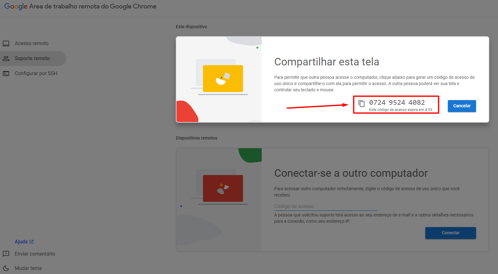 Clicando em "+ Gerar código" irá exibir uma numeração que é só você copiar e enviar para quem for acessar sua tela.